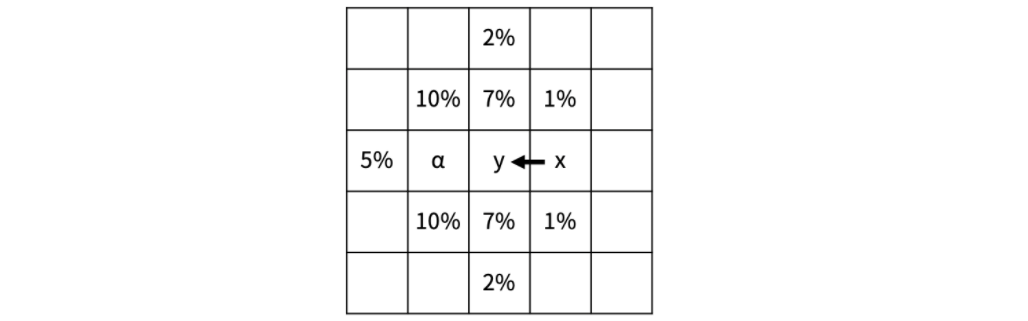 int now_sand = (arr[x][y] * r[dir][i]) / 100;