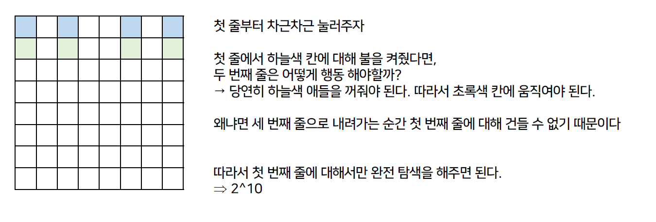 한 줄에 10칸이므로, 2^10 번에 대해서만 탐색을 해주면 되고, 이는 시간 제한 안에 충분히 수행할 수 있다.