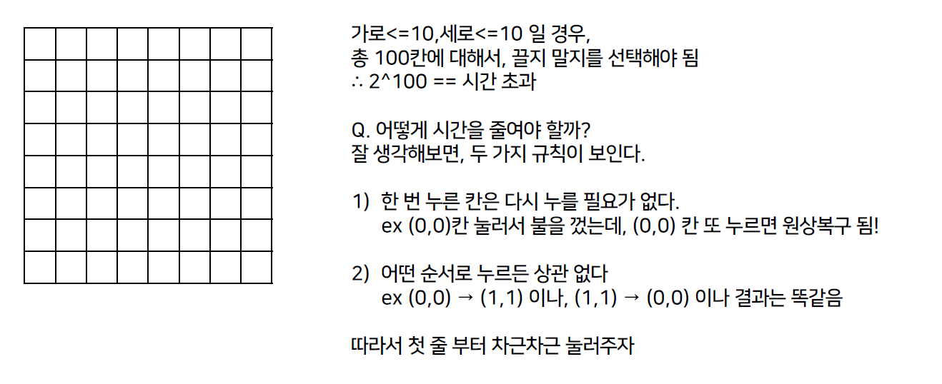 3. 각 경우의 수 마다, 두 번째 줄~ 마지막 줄까지 for문을 돌면서 불을 켤지 말지를 처리 해준다.